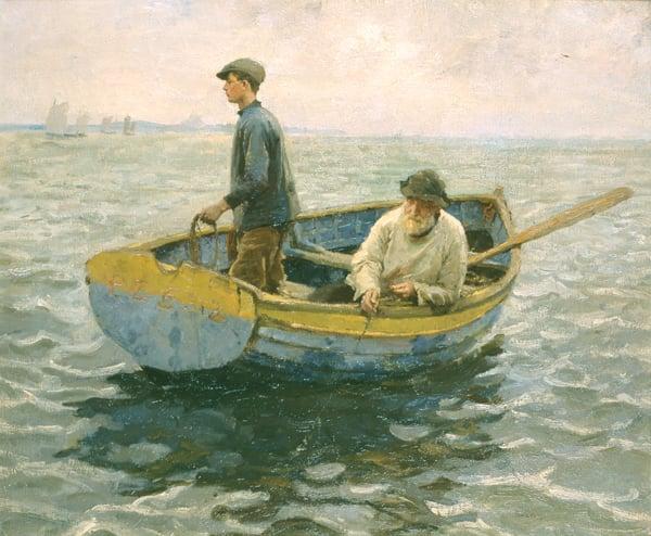 The painting depicts a small dinghy at sea with a young man standing holding a fishing line in his hands while an older man is holding a line in the water. St. Michael's Mount can be seen in the far distance.
