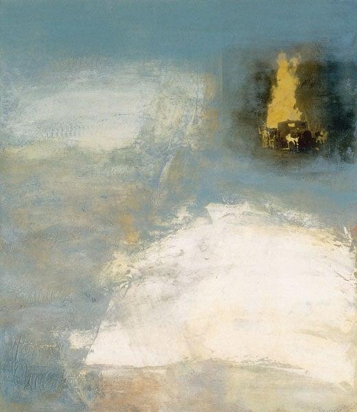 One of a series of works by the artist about France during the Second World War and the retreat of 1940. Huppy is a small rural town in Belgium, and the artist has used an archive photograph of a burning truck to investigate the emotive theme of an abandoned landscape. The photograph is positioned in the top-right of the canvas and is used as a trigger to consider the expressive and formal qualities of the remainder of the picture surface.