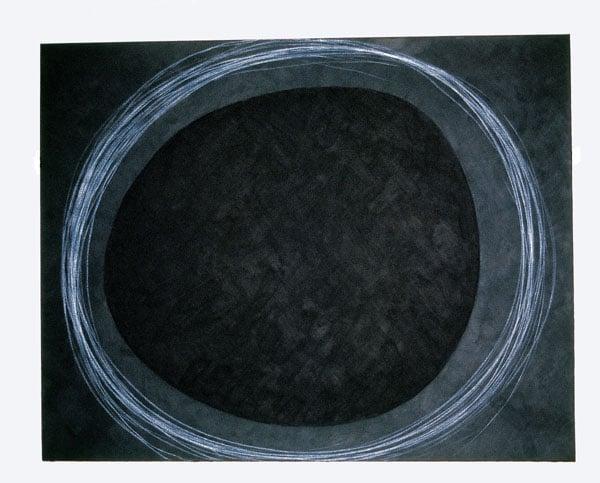Inspired by the landscape visible from the artist's studio on the shores of Lower Loch Erne and referring to the ancient ruins of Inishmacsaint found on a nearby island. Two concentric circles direct the eye to the inner space which is devoid of imagery save the criss-cross affect of the brushwork. The outside of the circle is composed of numerous lines that evoke a celtic-like image. The final work, whilst abstract, is nevertheless evocative of 'place' and reflects the moodiness and soft light of the area. Purchased by the Art Fund with the assistance of the Esmée Fairbairn Foundation.