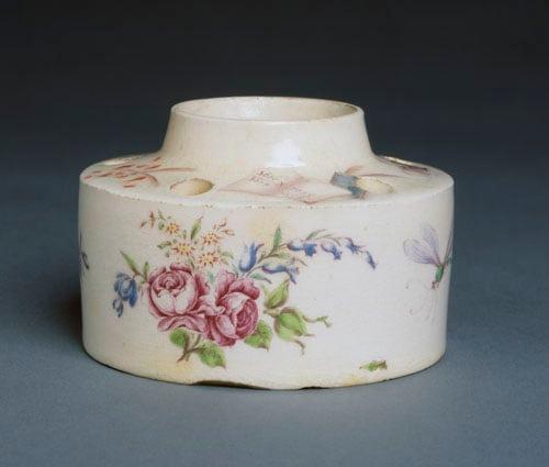 This ink-pot is of great documentary significance. Welch or Welsh had long been known as a recorded personality but the appearance of this signed piece, decorated with a bouquet, loose flowers, a dragonfly and quills, dividers and rulers, was the first opportunity to associate a clearly-defined style with the name. On the basis of this piece the Ceramics Department of the V & A were able to attribute parallel examples, unsigned, within the collection.