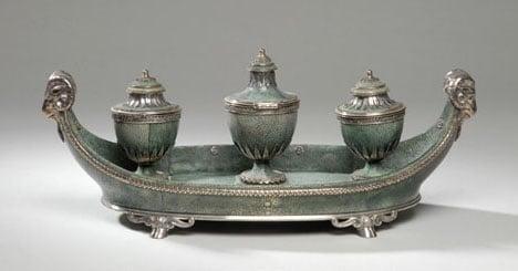 Decorative use of shagreen, a hard, highly-polished material made from skin of sharks and commonly employed in 18th Century for covering small boxes, knife-cases etc. Here it has been dyed green. 3 vase shaped wells fitted with clear-glass liners. Base covered with the original green silk. Workmanship of English characteristics - suggestions from Matthew Boulton's craftsmen who emigrated to Russia.