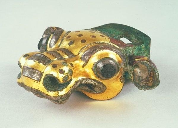 3 pieces of bronzework inlaid with gold and silver from the Chin-t'sun treasure. Finial of a central chariot pole, in the shape of a buffalo head (16 cms); and two pieces for side shafts representing dragons' heads (both 27 cms), Han dynasty.