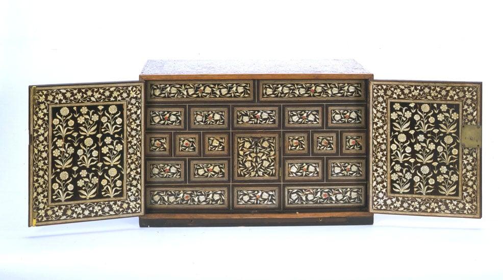 Indian cabinet of ebony inlaid with ivory, dated to first half of eighteenth century (mounted on an English walnut stand circa 1760). Inside small drawers and a cupboard.
