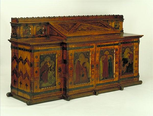 Cabinet of inlaid oak with painted panels by Ford Madox Brown, D G Rossetti and Sir Edward Burne-Jones.