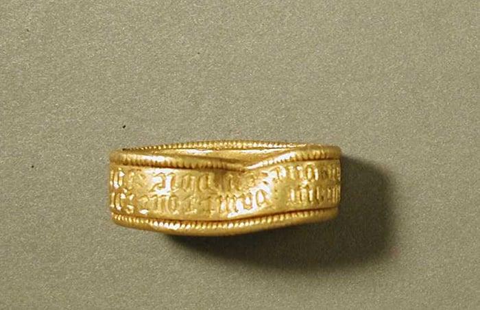 This ring is likely to be English and consists of a flat band with an applied, beaded border and a double lined inscription. It may have been the treasured property of Staffordshire nobility as it was found near Chartley Hall and Chartley Castle and bears an inscription in French, the language of the English aristocracy. The inscription reads 'Amour vault tout fors ceur de villain Amour envoie coullas e joie' (Love is worth much more than a base heart Love sends [or brings] solace and joy).