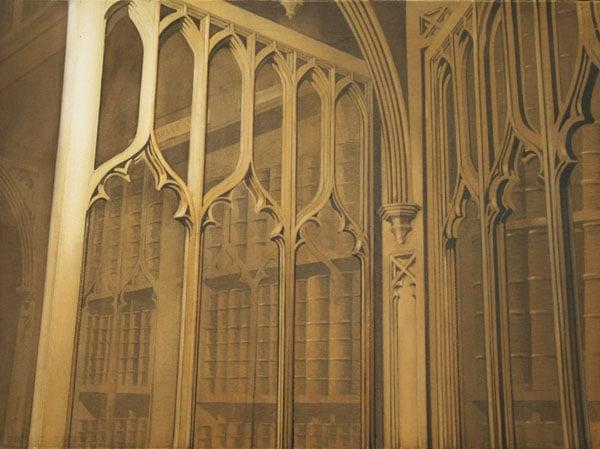 This work depicts the Divinity Library of King's College, Aberdeen and is a timely acquisition as a new library is being built at the University. This watercolour is part of a series on the forgotten great rooms of European architectural heritage, where the histories and treasures can sometimes eclipse the elegance and the beauty of the fine places in which they are housed. The artist has focused on the fine architectural details of the glazed library cupboards and has used reflections in the glass to extend the view around the room. The restricted palette suggests associations with historical illustrations but it also describes the restricted light within the library setting.