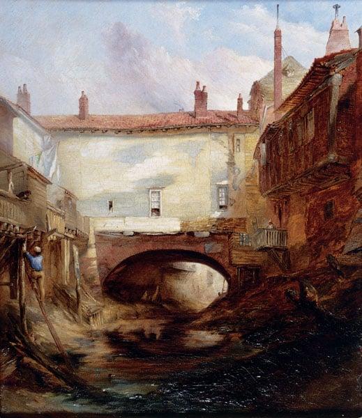 This painting shows a view of the High Bridge over the Purfleet, King's Lynn, looking west towards the Great Ouse River, into which the Purfleet drains. Several inhabitants can be seen in the painting, looking out of their dwelling on either side of the filthy Purfleet, which was used both as an open sewer and a source of drinking and washing water.