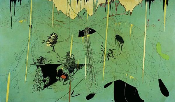Todd's work is reminiscent of Oriental art, in particular the Japanese art of lacquering. He has also been influenced by the concept of void and form in both Chinese and Japanese landscape painting, where the space between the forms is as important as the forms themselves. This work includes dotted swags and flat colour downstrokes.
