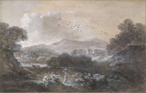 Italian landscape with peasants in the foreground. Signed with monogram.