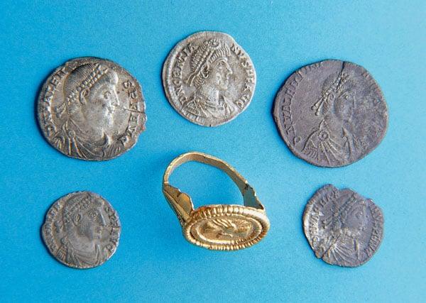 Group of 10 objects comprising of 1 gold ring (plain hoop which expands at the shoulders to a double-scalloped 'V' shape; oval bezel decorated with two clasped hands and a double beaded border), 1 gold coin (a solidus dating from the reign of Valentinian II), and 8 silver coins. These are the most recently located material from the Bowerchalke Hoard; the Art Fund previously supported earlier finds in 2002 (see review number 5131).