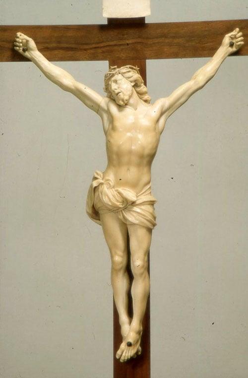 The quality of this crucifixion figure confirms Le Marchand's reputation as the most distinguished ivory carver working in England in the early 18th century. The subtly-modelled musculature of the torso and the heavily-bunched draperies of the loin cloth give the figure a monumentality unusual for its size. It is from the tradition of French sculpture that Le Marchand's baroque Christ is ultimately derived.