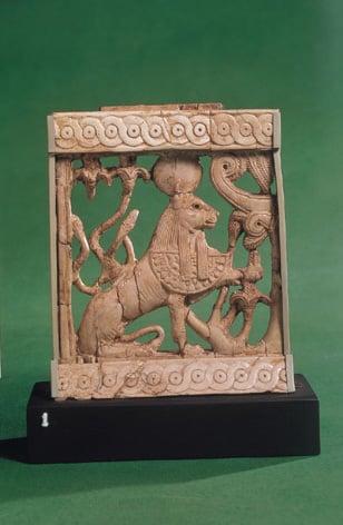 Openwork plaque depicting seated lion crowned by Egyptian sun-disc and wearing Egyptian collar and wig (usually restricted to Pharaoh). One paw raised and placed on branch of 'sacred tree'. Mixture of Egyptian/Syrian motifs - typical of Phoenicia.