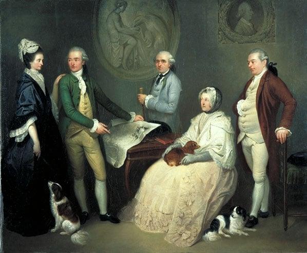 The sitter was the principal antiquarian cicerone, or guide, to the English visitors to Rome. He was a colourful and opinionated character. Here, he points to a map of Italy with his sister Isabella on left. The portly figure on right is his partner Christopher Norton. The elderly couple in the centre are his parents.
