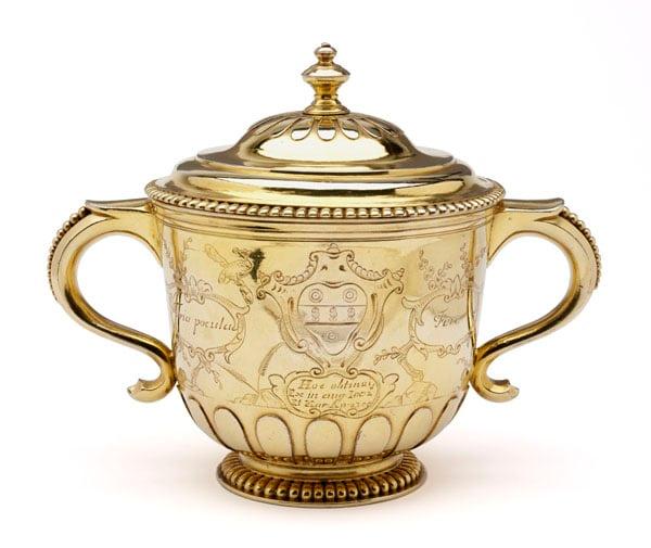 This cup carries an inscription commemorating the Coronation of James II on 23rd April 1685. It was made from the silver of the stave mounts and bells which supported and adorned the coronation canopies held over the King and Queen. The cup is also decorated with 'Chinoiserie' figures supporting a canopy, a style fashionable in the 1680s. The Coronation was fully documented by the contemporary Leicester herald, Francis Sandford and his account is held at the National Art Library in the V&A. The account is illustrated with engravings of the Coronation procession which shows the canopies held over the King and Queen.
