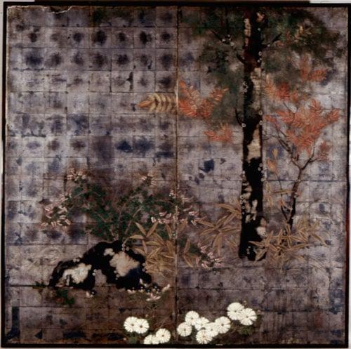 Young Fir and Red Acacia on a two fold screen in silver ground. Signed and sealed: Hoitsu.
