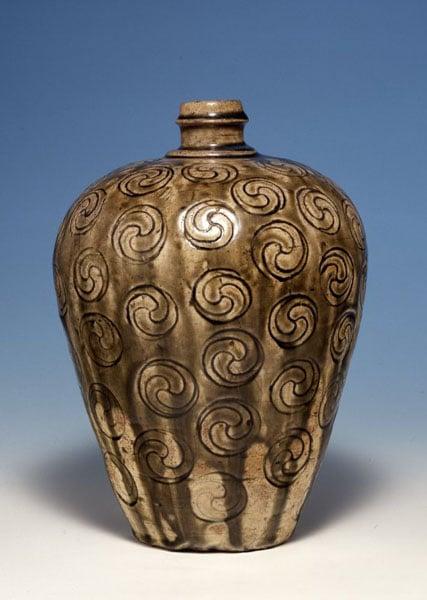 This old Seto stoneware vase is decorated, under the transparent green glaze, with an incised pattern of whorls. It combines technical mastery with a characteristically Japanese freedom of execution. The Seto kilns were the principal source of glazed stoneware in medieval Japan, and their establishment in the thirteenth century marked a new beginning in Japanese ceramics.