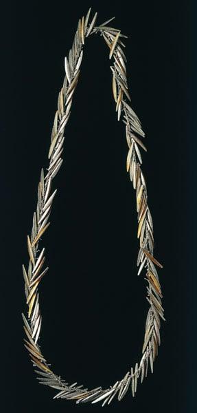 This necklace is a testament to the artist's proficiency as a goldsmith, through her intricate working and use of granulation technique, and expresses her fascination with the surface of the metal through the fusion of fine gold on to the platinum. The subtle coloration and texture created through the fusion process, together with the playful interaction of individual components of the necklace create a sense of drama and movement when the object is seen against the body. This necklace was among the work selected by Mina to represent her in the Jerwood Prize 2000, which she won.
