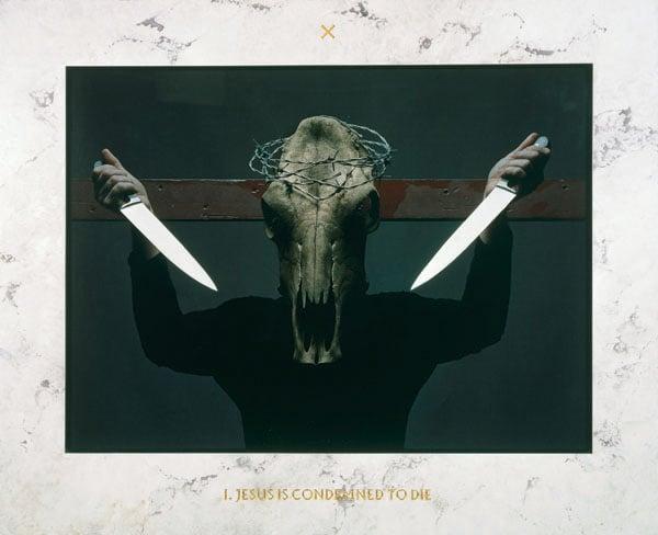 A work from a series of 14 large scale colour photographs titled 'Stations of the Cross' which disturbingly portray the final hours of the life of the condemned Christ. Damien Hirst and David Bailey closely collaborated on the series and both have a fascination with the use of Christian iconography. This work is a simple, powerful image which captures symbolically the agony of Christ.