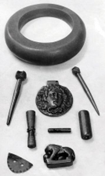A hoard of Late Roman jet jewellery, discovered during excavations off Hall Street in Chelmsford (the Roman town of Caesaromagus). The jewellery is exquisitely carved and includes a Lion pendant, an articulated necklace and bracelet, hairpins, an armlet, and the Medusa Pendant, described as 'the finest found in Britain'. The collection illustrates the adornment of a wealthy lady of Late Roman Britain, and is likely to have been a votive deposit. Jet is a form of petrified wood and was collected at Whitby in Yorkshire.