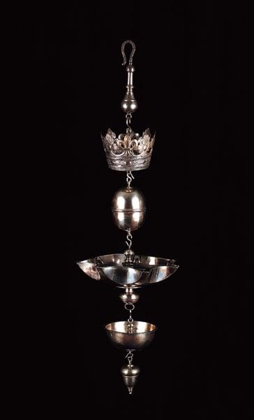 Sabbath Lamp, composed of six parts joined by S hooks, a traditional form of which several Continental examples are known. The maker, Abraham D'Oliveyra, of Dutch origin from Amsterdam, was the earliest known Jewish silversmith working in London.