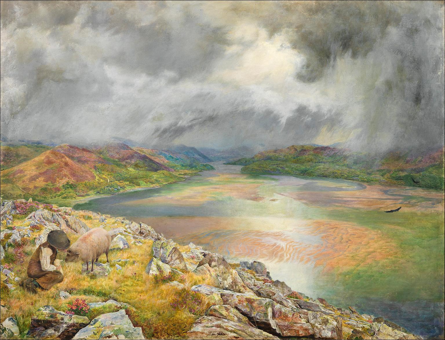 This painting shows a dramatic view of the Mawddach Estuary in northwest Wales, with the distant mountains veiled by rainclouds and a boy holding a lamb beside its mother in the foreground. Ruskinian principles of truth to nature are evident in the meticulously detailed rocks, plant life and weather conditions.