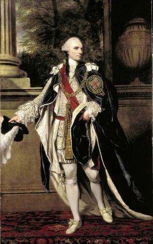 This full-length portrait shows the Earl in Garter robes, advancing slightly to the left, but looking round to the right. He holds his hat in his right hand, and stands between a column and an urn. The prevailing colour in this figure is a silvery white, with the blue of the mantle subdued so that despite the grandeur of dress and pose, the eye is at once led to the tactile flesh-tints of the face and to the sardonic expression, sensitive mouth, and black eyebrows of the much-criticised statesman Earl.