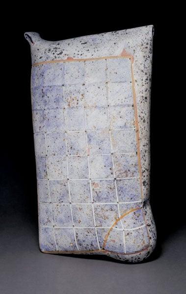 The piece has been hand-built, pierced and decorated with coloured slips and oxides. It has an irregular sack shape and is coated with a greyish-white slip. The subtle decoration consists of a rectangle outlined in pale orange-brown, chequered with white lines with pin holes at the intersections. This piece owes something to the influence of Gordon Baldwin.