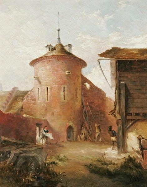 This painting shows the round tower of the Kettle Mills, and includes mill workers carrying out their tasks. The Mill served as the storage and pumping station for the town's water supply until a constant supply was obtained in 1866. The tower was originally part of the English Civil War defences of the town. The buildings were demolished in 1972.