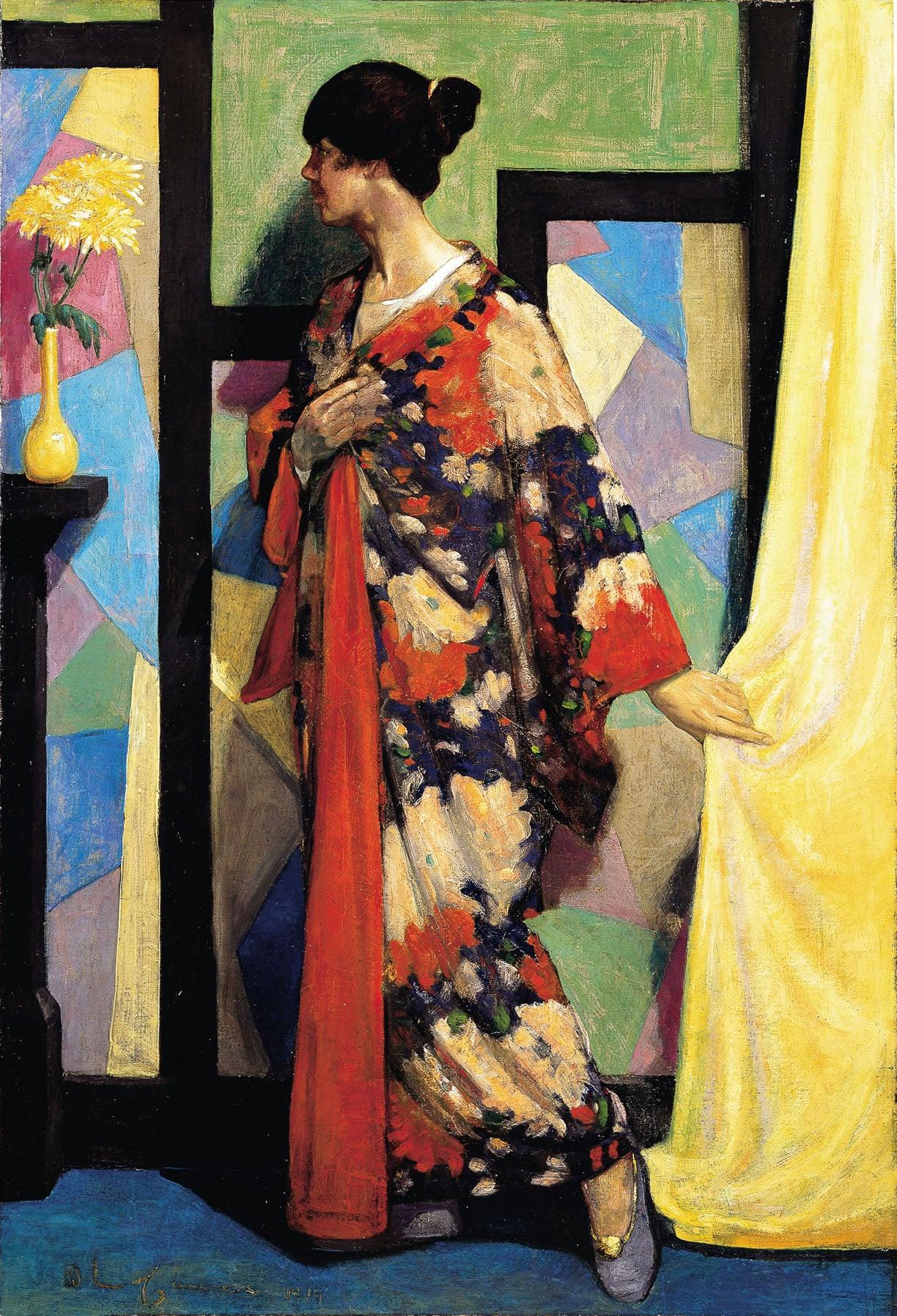 Portrait of Agnes Miller Parker (the artist's wife) wearing a full length kimono. Behind her stands a screen made up of abstract colours and shapes enclosed in a black frame.To the right is a yellow curtain which she holds in her left hand.