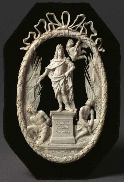 This relief of King Louis on a pedestal is inscribed with 'To the Victory of Louis the Great'. The ivory serves as a testament to the rise of France as the most powerful nation at the end of the 17th century under the rule of Louis XIV. It highlights the extraordinary contribution of Huguenot artists and craftsmen to European Enlightenment culture. Furthermore it demonstrates the links between France and Scotland, and the supreme skill of its native ivory carvers, transmitted to the British Isles by the creator of this most unusual piece.