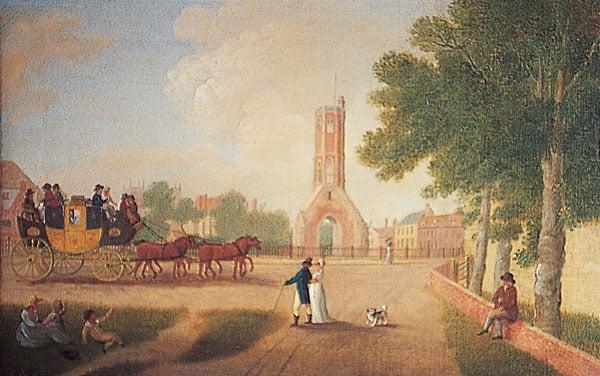 Depicts the stagecoach entering King's Lynn with Greyfriars Tower in the background. The rest of the painting is more like a pastoral scene than a streetscape with a couple strolling across the road and children playing at the roadside.