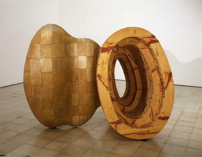 This sculpture asks to be approached and touched or even crawled through. The parts combine contrast and paradox: one open to light and air but massive; the other closed, ostensibly armour-plated but light. Separated, each would roll over.