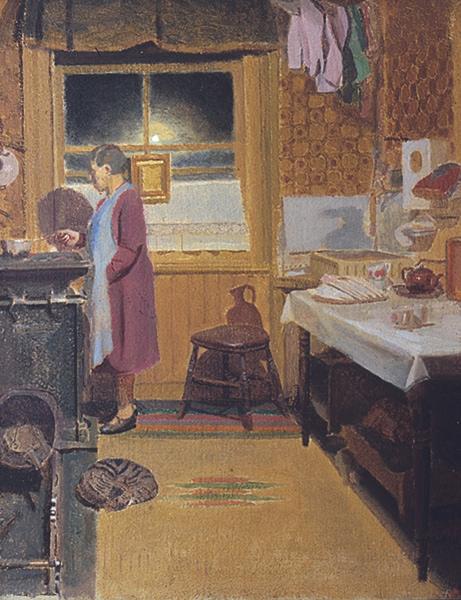 A kitchen interior with a figure and a cat. Mr Thomas Balston bequeathed a large collection of pictures, drawings, and prints to the Art Fund, with the request that his extensive collection of works by, after, and connected with John Martin (on whom he had written a monograph) should be offered to the Victoria and Albert Museum, that the Ashmolean Museum should be allowed to take what it wanted of the rest, and that the residue should, so far as possible, be distributed among other public institutions in Great Britain.