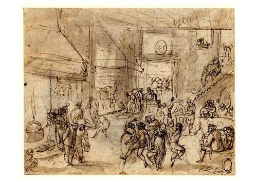Kitchen interior with figures dancing in front of musicians in the centre. This is one of 111 drawings bequeathed to the British Museum by Rosi Schilling in 1997. The majority of this collection of drawings formed by Dr Edmund Schilling was bequeathed to the British Museum through the Art Fund by his widow, Mrs Rosi Schilling, in 1993. Schilling was a former curator of the Stadelsches Kunstinstitut in Frankfurt, who emigrated to England in 1937. He was one of the few acknowledged specialists in this country on German graphic art, and built up his collection during the 1940s and 1950s in London when, Northern drawings were unfashionable and could be bought relatively inexpensively. His collection included drawings by major artists such as Hans Baldung and Lucas Cranach.