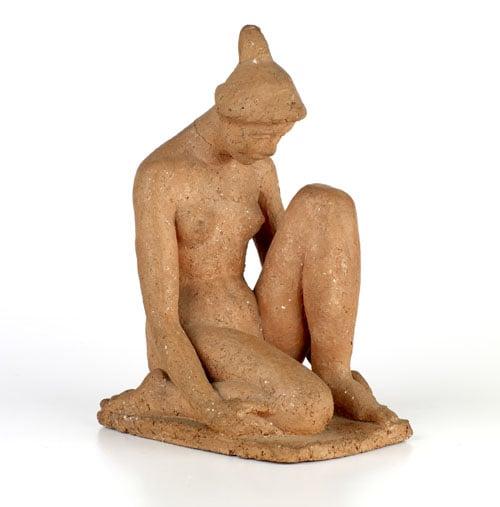 The statuette is also known as Seated Girl. With incised monogram, 'AM'. Part of a bequest to four museums by Alec Clifton-Taylor through the Art Fund in 1987.