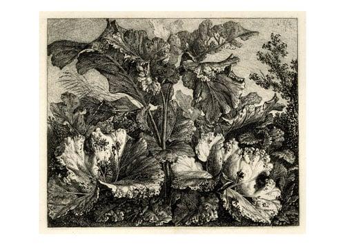 Kolbe developed several types of landscape work but the most remarkable were the 'Krauterstucke', which are unparalleled in the work of any other artist. Typically, leaves of cabbages and other plants are expanded to such a size that they dwarf men, animals and even trees. In these two prints, all figures, whether animal or human, are omitted. All that is Ieft are the leaves, but with dislocations of scale inbuilt so cunningly that the very small etchings (barely six inches across) appear to be colossal. The study of giant vegetation with large rhubarb leaves is illustrated here.