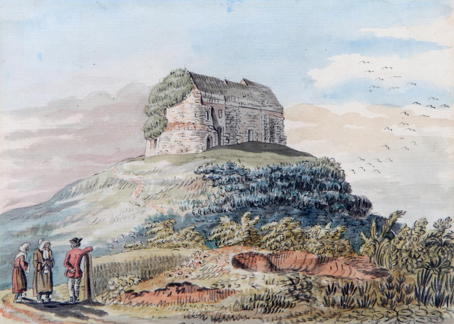 This watercolour is the earliest known view of La Hogue Bie, a medieval chapel in Jersey. The group of figures to the left represent one of the first depictions of the island's famous knitting industry.
