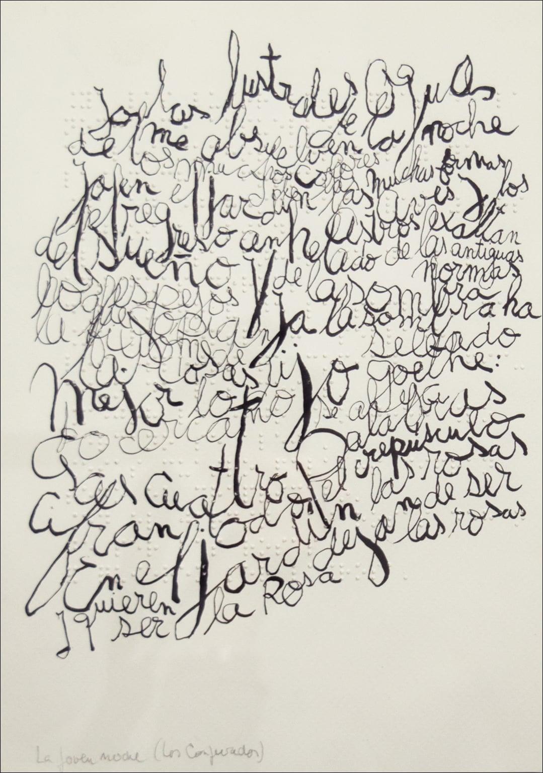 Leon Ferrari was one of the most significant Latin American artists of the 20th century. He was one of the leaders of the international Conceptual Art movement, working in a wide range of media to create works that often explored Catholic imagery. He won the Golden Lion at the 2007 Venice Biennale, and his work has been collected by institutions ranging from Tate to the Museum of Modern Art in New York. Ferrari created La Joven Noche (The Young Night) in 2000 as part of his ‘Brailles series’, a number of works initially inspired by the love poetry Argentine writer Jorge Luis Borges, who was blind from the age of 55. Ferrari presented Borges's love poetry in braille superimposed on images of nude women, so that viewers would have to 'caress the woman in order to read what the poem says'. La Joven Noche was inspired by Borges's poem of the same name, written a year before the writer’s death, in which Borges describes coming to terms with his blindness. The poem is overlaid in both braille and calligraphy, recalling Ferrari's earlier calligraphic works.