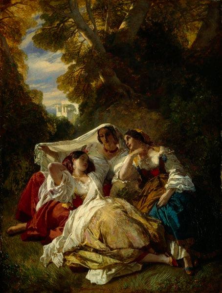 This work was purchased by Queen Victoria and placed by the Queen in her dressing room at Osborne House where she would have seen it every day during her many visits to the house. The small intimate painting depicts three young women shading themselves from the midday sun in the Mediterranean south. Winterhalter was one of the foremost portrait painters of the mid-nineteenth century. He was in great demand at all the royal courts of Europe and painted over a hundred portraits for Queen Victoria alone. This work was the first one purchased by The Queen and she named this style of genre scene a 'fancy picture'. Osborne House still has nine portraits by the artist but all the 'fancy pictures' by Winterhalter which originally hung in the house have since been removed.
