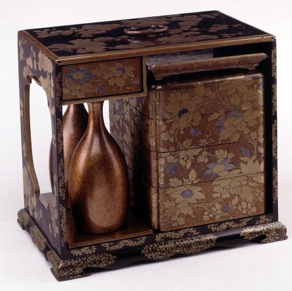 Set in Takamakye technique, consisting of tiered box and lid, 2 bottles, drawer and tray. The case is decorated with gourds in gold on a black ground, the drawer and trays with clematis in gold and silver on pear-skin ground, and the bottles with pear-skin ground. Part of a gift of seven works donated by Miss A V Hammond through the Art Fund to the British Museum in 1964.
