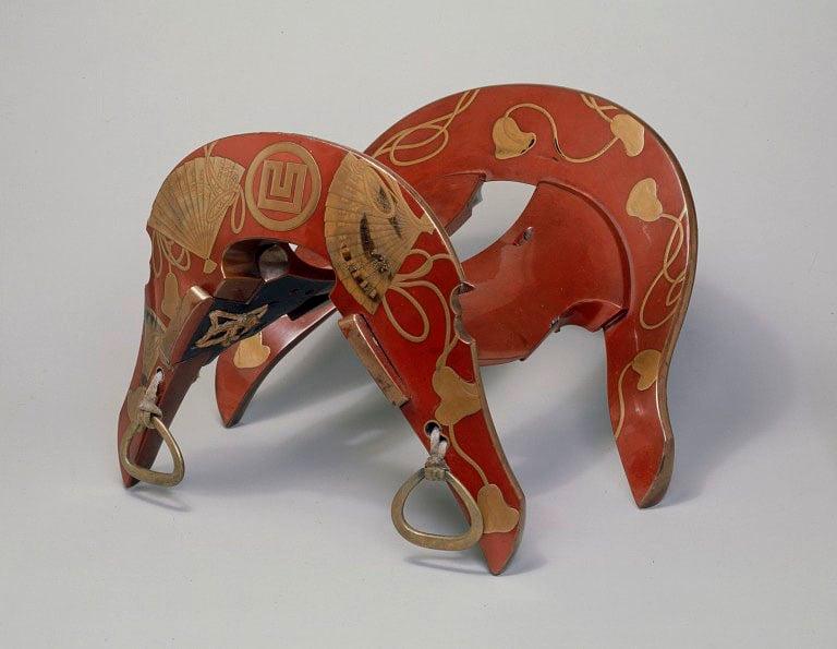 1. Lacquer saddle, red wood, openwork construction, with gilt decoration; 2. A pair of stirrups, iron with pattern, inlaid in silver.