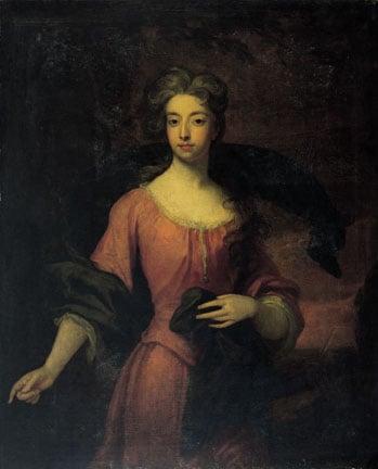 3/4 portrait, she stands with left arm bent to her waist and holding one end of a dark flowing wrap. Her right hand points out to her right. She wears a faded red gown and her hair is pulled back with tendrils escaping
