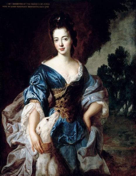Lady Mary is depicted as Diana and with a hound wearing a gold collar adorned with the Herbert arms surmounted by a viscountess's coronet. The portrait is part of a group of portraits from Coughton Court, the seat of the Throckmorton family, which testify to the links of this Jacobite family with France.