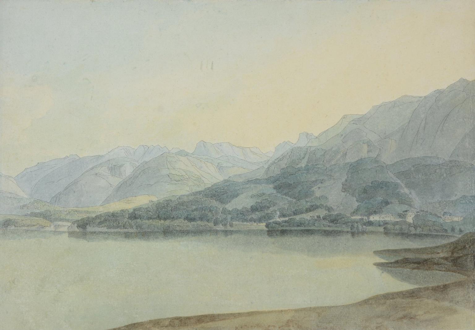 This atmospheric watercolour by Francis Towne shows a view across the head of Lake Windermere with the profiles of Crinkle Crags, Bowfell and Langdale Pikes in the distance.