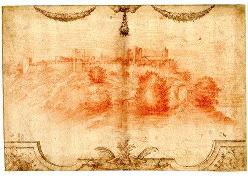 This shows a view of a castle or fortified town on a hill, with trees in the foreground.