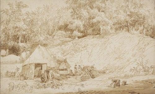 On the left are two thatched sheds, near which are figures, a hand-cart and two pigs. The ground slopes steeply up to a wood behind; in the foreground on the right is a woman bending down.