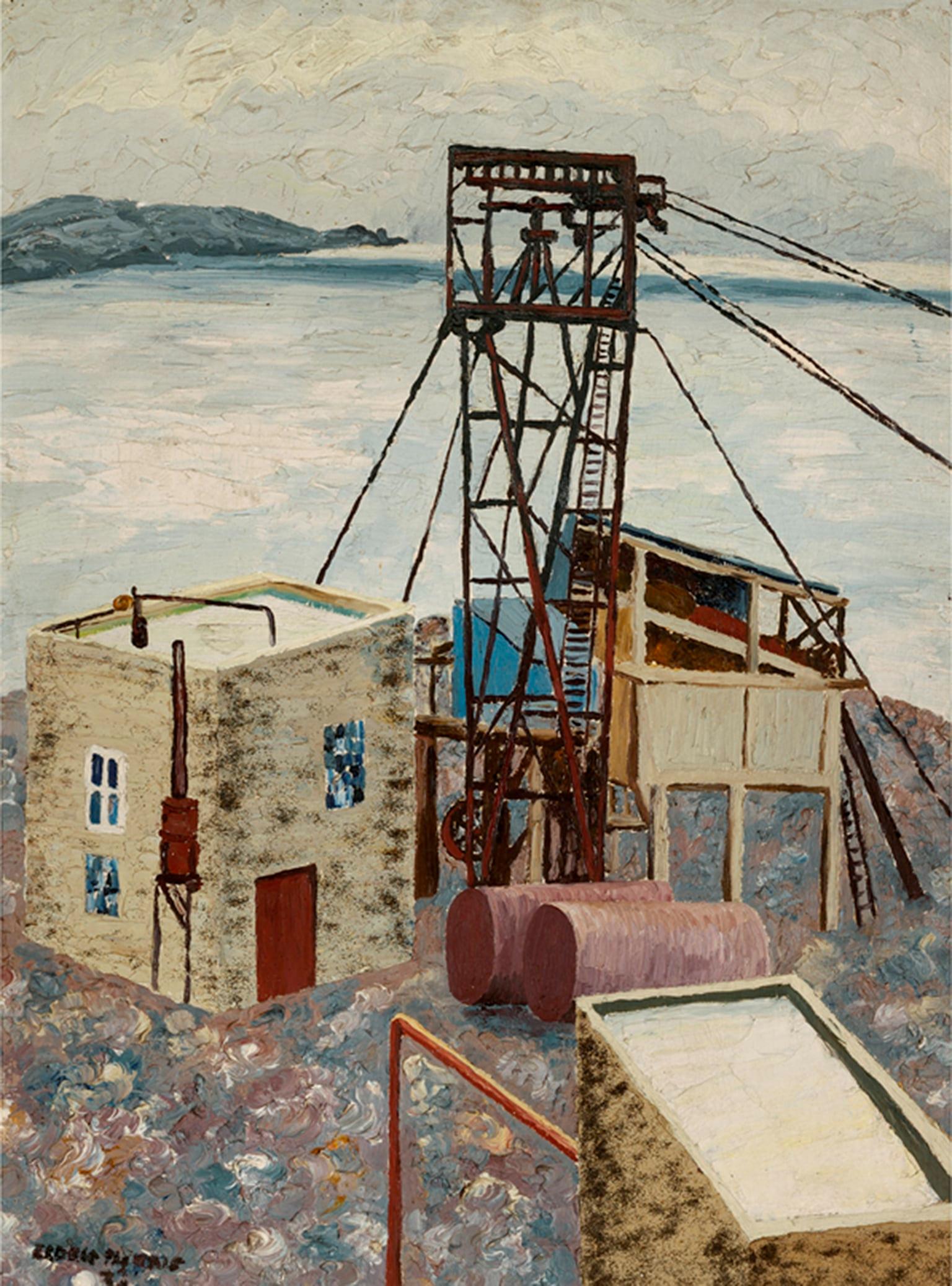 Possibly influenced by Cedric Morris’s knowledge of the Post-Impressionist and modernist painters who frequented his studio, this early example of naive or ‘innocent eye’ painting depicts Penlee Quarry on the outskirts of Newlyn, near Penzance.