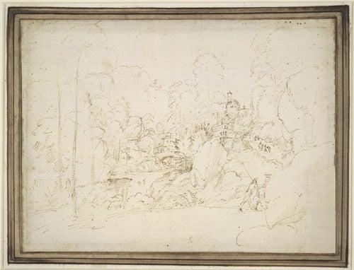 Shows a wooded ravine, and a road, figures and a horseman climbing to a church; to the left other buildings and a bridge spanning a stream. One of 41 drawings from an album put together by the Florentine marchand amateur, Franceso Maria Gaburri circa 1725.