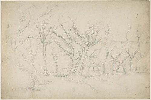 A landscape sketch of buildings seen in the gap between a group of leafless trees- a fine example of Cezanne's draughtsmanship. First Cezanne landscape drawing to be acquired by BM.