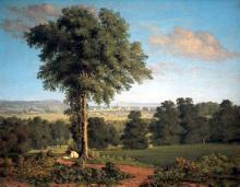 Countrside landscape with green foliage. A large tree stands to the left in the foreground with a figure sitting at its base. Oxford can be seen in the distance.